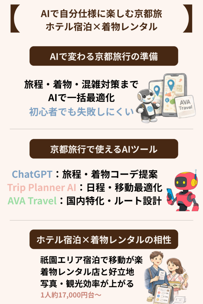 着物レンタル+観光では着付け時間・移動・混雑予測が重要。AIツールを使えば希望条件を入力するだけで最適旅程を自動生成。初心者でも理想の京都旅が実現します。