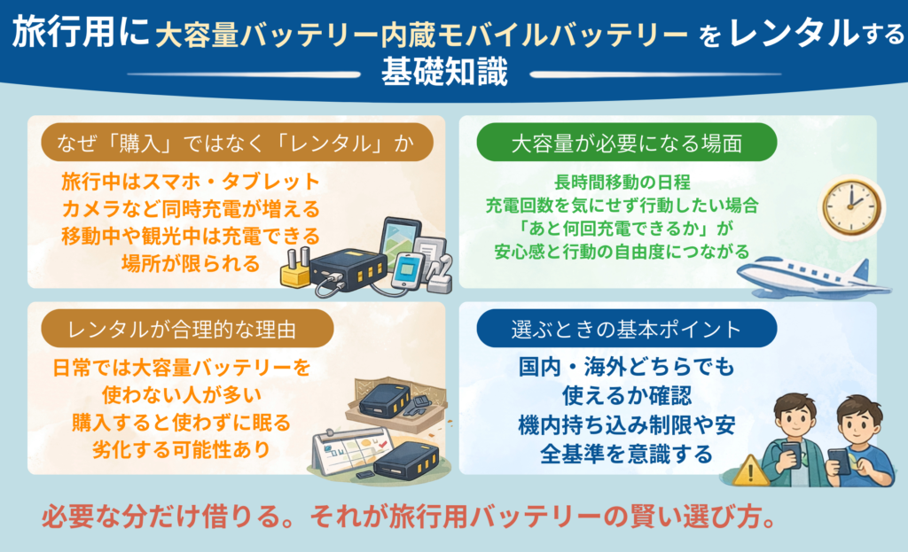 旅行用として大容量バッテリー内蔵モバイルバッテリーをレンタルする場合、まず押さえておきたいのは「なぜ購入ではなくレンタルなのか」という考え方です。