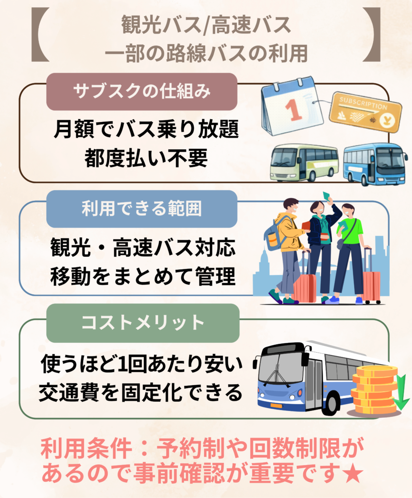 サービスの構成は大きく分けて、観光バス単体型と、路線バスや高速バスを併用できるタイプに分かれます。観光バス単体型は、観光地向けの移動に特化しており、週末利用やレジャー目的と相性が良いのが特徴です。観光スポットを効率よく巡れる反面、平日の移動や日常的な利用には使いにくい場合があります。