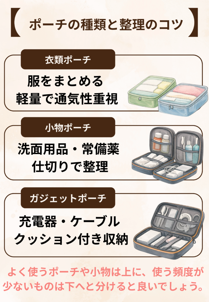 ポーチ類の種類と用途別の整理パターン