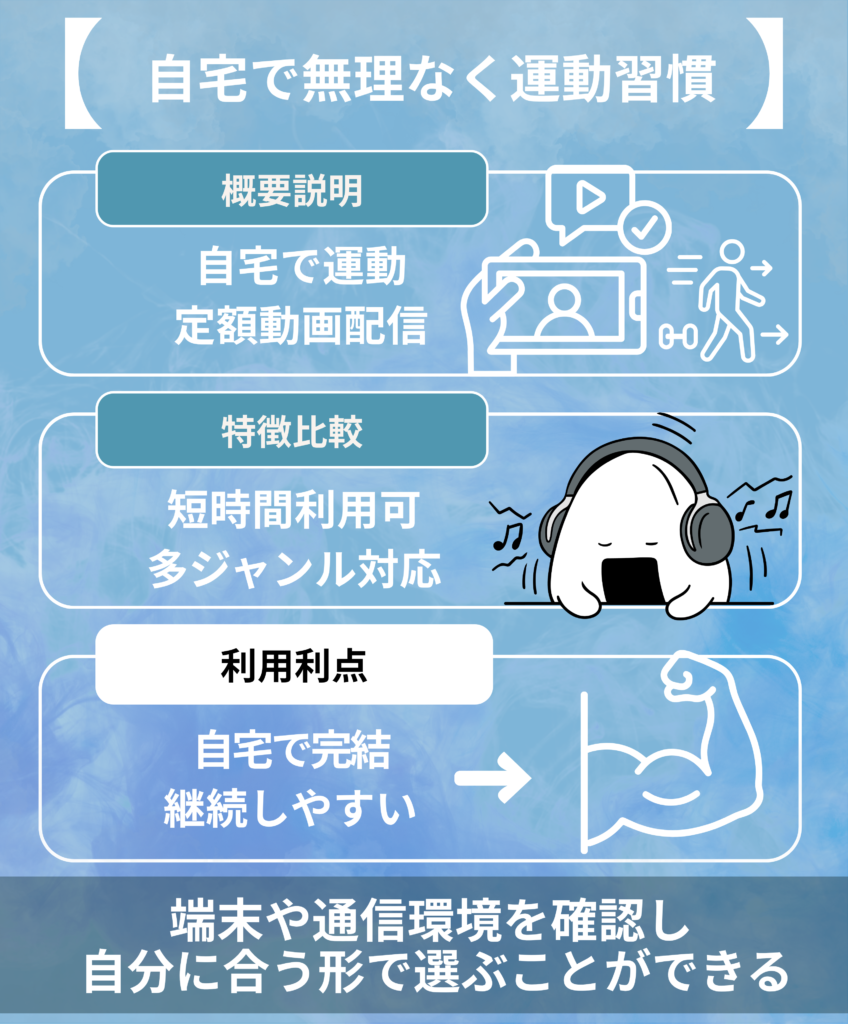 朝の起床後や夜のリラックスタイムなど、生活の一部として運動の時間を固定すると習慣化しやすいです。 - 好きなジャンルを選ぶ