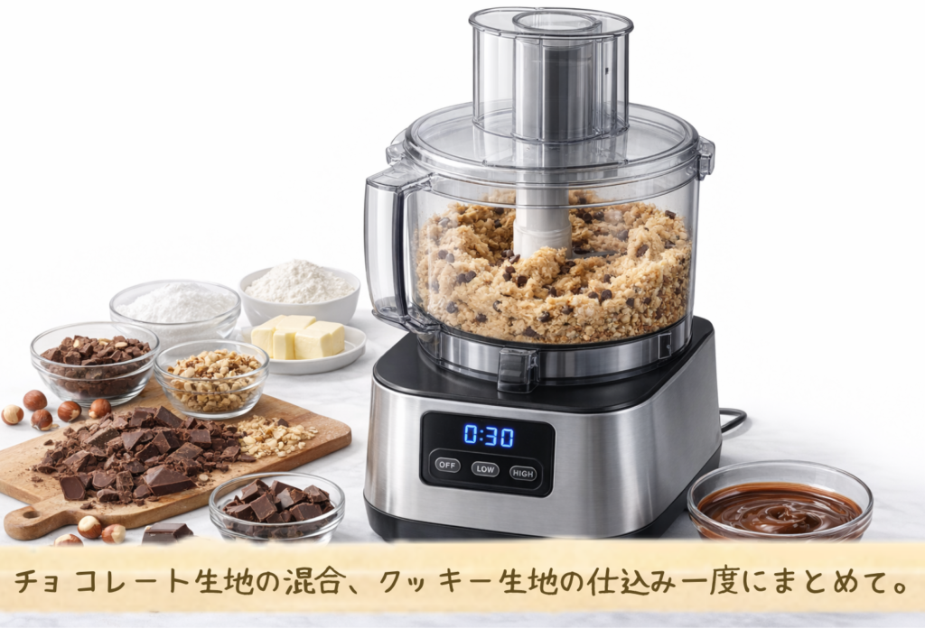 家庭用では途中で止めながら様子を見る場面でも、大型機なら連続運転が可能なため、仕込み作業全体の流れが途切れません。短時間で大量に仕上げたいバレンタインシーズンにおいて、大型フードプロセッサーは現実的で効率的な選択といえます。