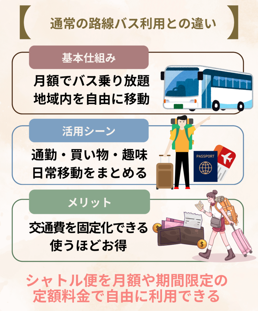 地域バスパスとは、対象地域内のバスを月額固定料金で自由に利用できるサブスク型サービスです。通常の路線バスでは、乗車ごとに運賃を支払う必要があり、利用回数が多いほど費用が増加します。