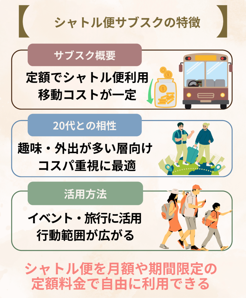 シャトル便サブスクとは、決まったルートやエリア内を走るシャトル便を、月額や期間限定の定額料金で自由に利用できるサービスのことです。都度予約してその都度支払う従来型の移動サービスとは異なり、毎月の出費が明確になり、移動コストを生活計画に組み込みやすい点が特徴です。特に20代は、趣味やイベント参加、友人との外出、週末の旅行や短期トリップなど、日常的に移動する機会が多い世代です。