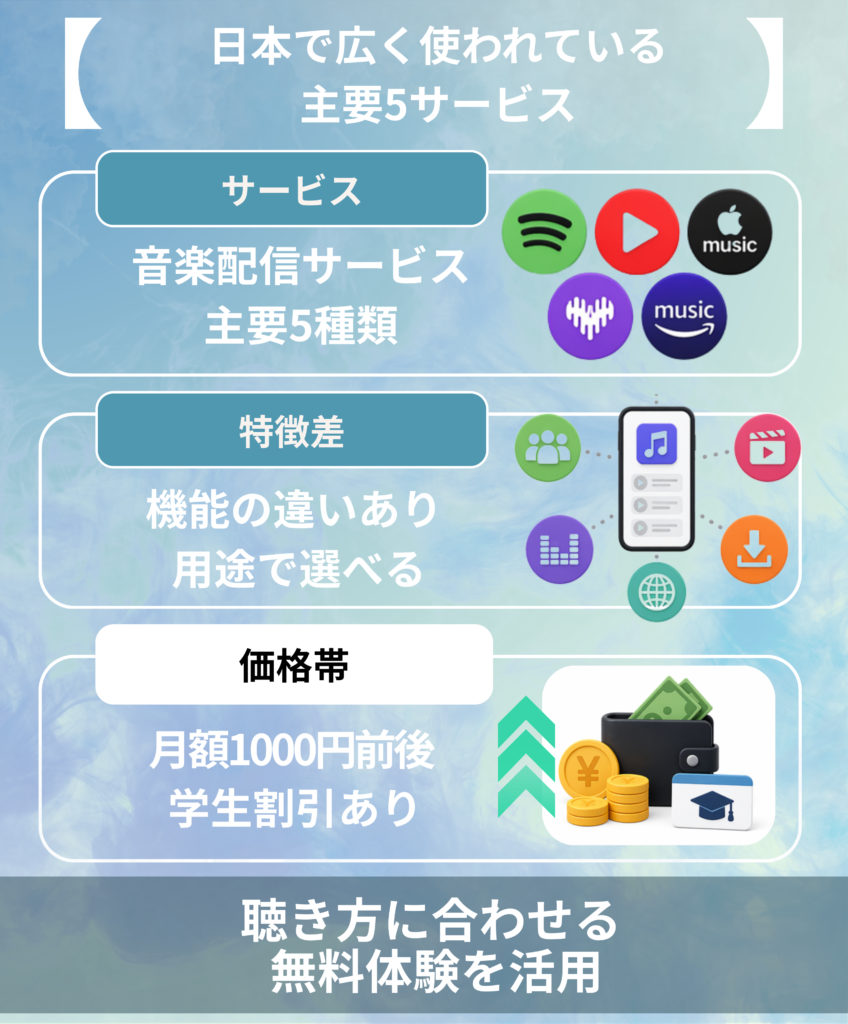 日本で広く使われている主要5サービスの料金比較です。学生プランや無料プランの実態も含めて整理。※料金はAndroid/Web中心の税込価格で、iOS/アプリ内課金は+100〜370円程度高くなる場合あり。
