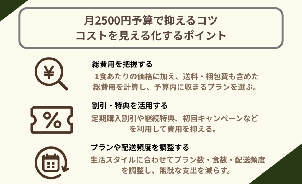 これらの調整を行うことで、無駄な費用を省き、月2500円の予算内で和食定期便を利用することが可能となります。