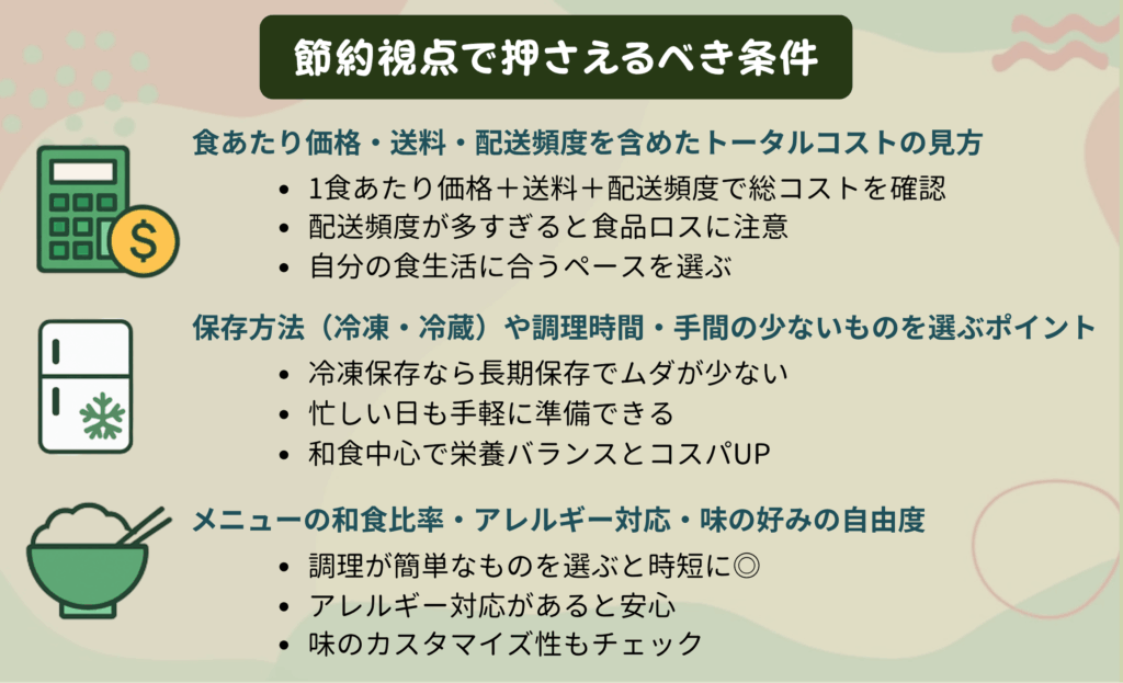 - 1食あたり価格・送料・配送頻度を含めたトータルコストの見方