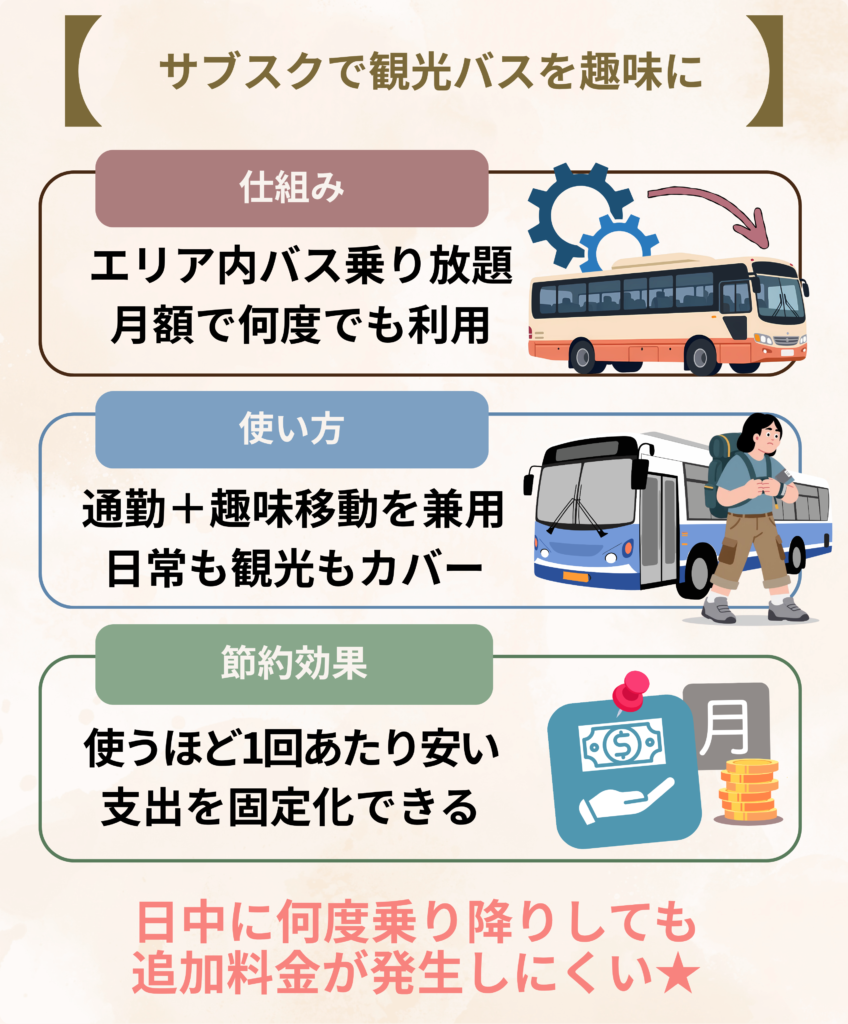 休日に観光地や少し離れたエリアへ出かける人にとって、地域バスの定額サブスクは非常に相性の良い選択肢です。