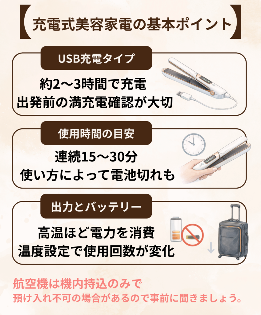充電式・バッテリー内蔵タイプの美容家電は、電源に縛られず使える反面、事前に仕様を把握しておくことが重要です。多くの機種はUSB充電に対応しており、フル充電までに2〜3時間程度を要します。連続使用時間は15〜30分前後が一般的で、旅行中の身支度には十分でも、使い方によっては途中で電池切れになる可能性があります。そのため、出発前に満充電かどうかを確認する習慣が欠かせません。