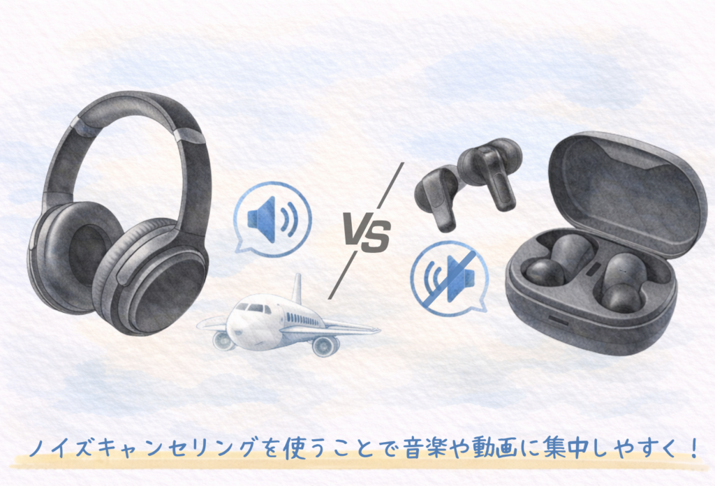 ノイズキャンセリング機器には大きく分けてヘッドホン型とイヤホン型があり、それぞれに向き不向きがあります。