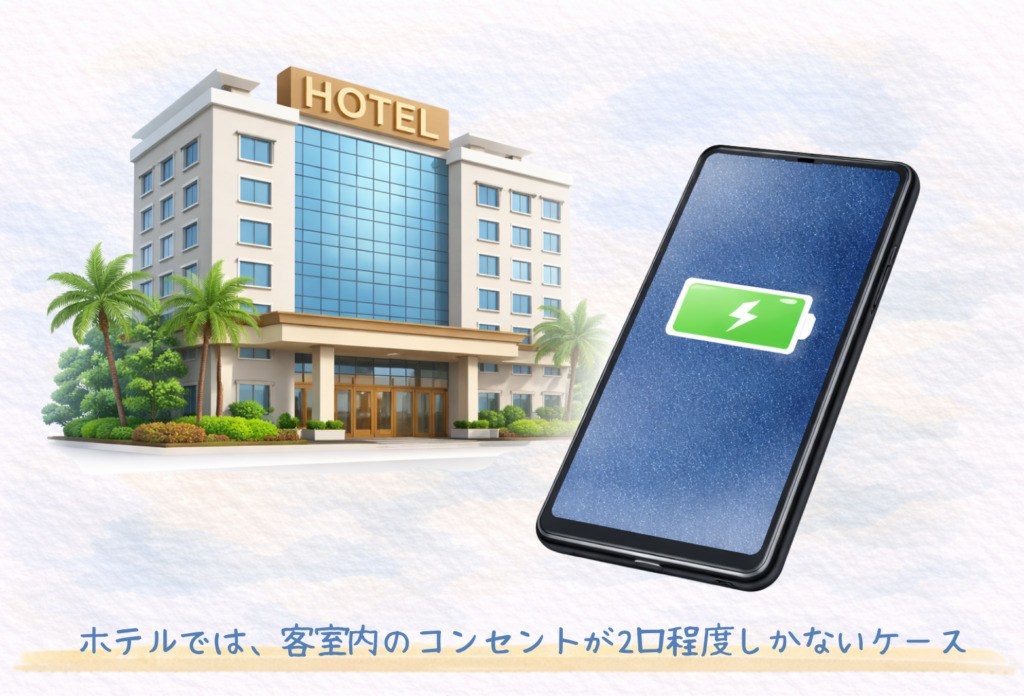 特に海外のホテルでは、客室内のコンセントが2口程度しかないケースも珍しくありません。デスク周りに1か所、ベッド付近に1か所といった配置では、仕事用PCと私用スマートフォンを同時に充電するだけで埋まってしまいます。そこに同行者の機器が加わると、順番待ちが発生することもあります。1泊2日や3泊4日の短期滞在でも、毎晩こうした不便さを感じる人は少なくないです。