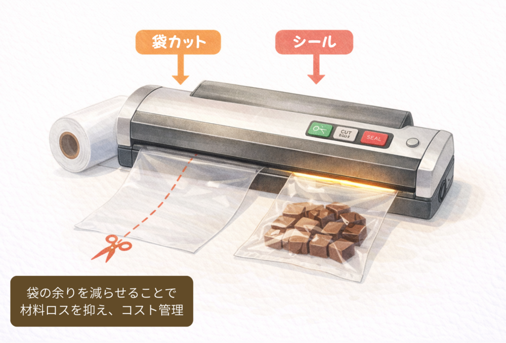 真空包装機には、吸引機能だけでなく作業を効率化するための便利な機能が備わっています。中でも袋カット機能とシーリング機能は、バレンタイン準備の現場で活用しやすいポイントです。袋カット機能を使えば、ロール状の袋を必要な長さに合わせて簡単に加工できるため、商品サイズに合わせた無駄のない包装が可能になります。袋の余りを減らせることで材料ロスを抑え、コスト管理の面でも効果が期待できます。